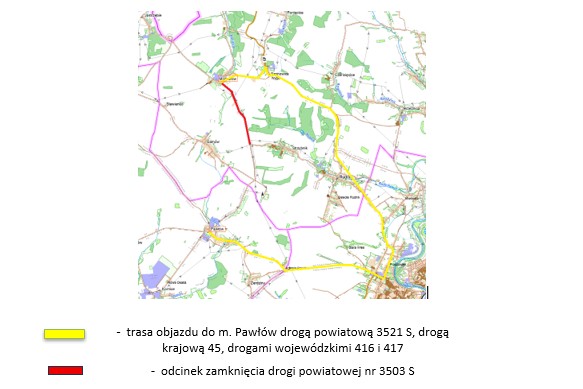 Począwszy od dnia 30.06.2025 r. następuje zmiana organizacji ruchu drogowego i ww. odcinek drogi zostanie zamknięty dla ruchu drogowego. Wprowadzone zostanie stosowne oznakowanie na czas realizacji robót z wyznaczeniem trasy objazdu do miejscowości Pawłów.