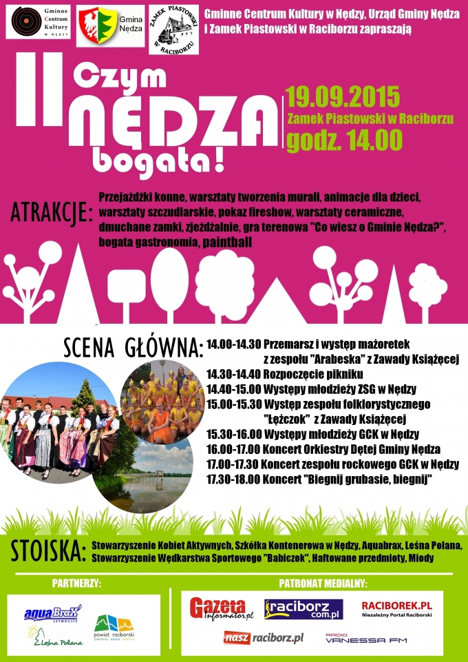W sobotę 19 września zapraszamy mieszkańców powiatu i gości na zamkowy dziedziniec. Tego dnia odbędzie się druga edycja rodzinnego pikniku – Czym Nędza bogata czyli dzień z Gminą Nędza na Zamku Piastowskim w Raciborzu. Familijne spotkanie pełne atrakcji rozpocznie się 14.00 i potrwa do ok. 18.00. Sprawdź program!!!